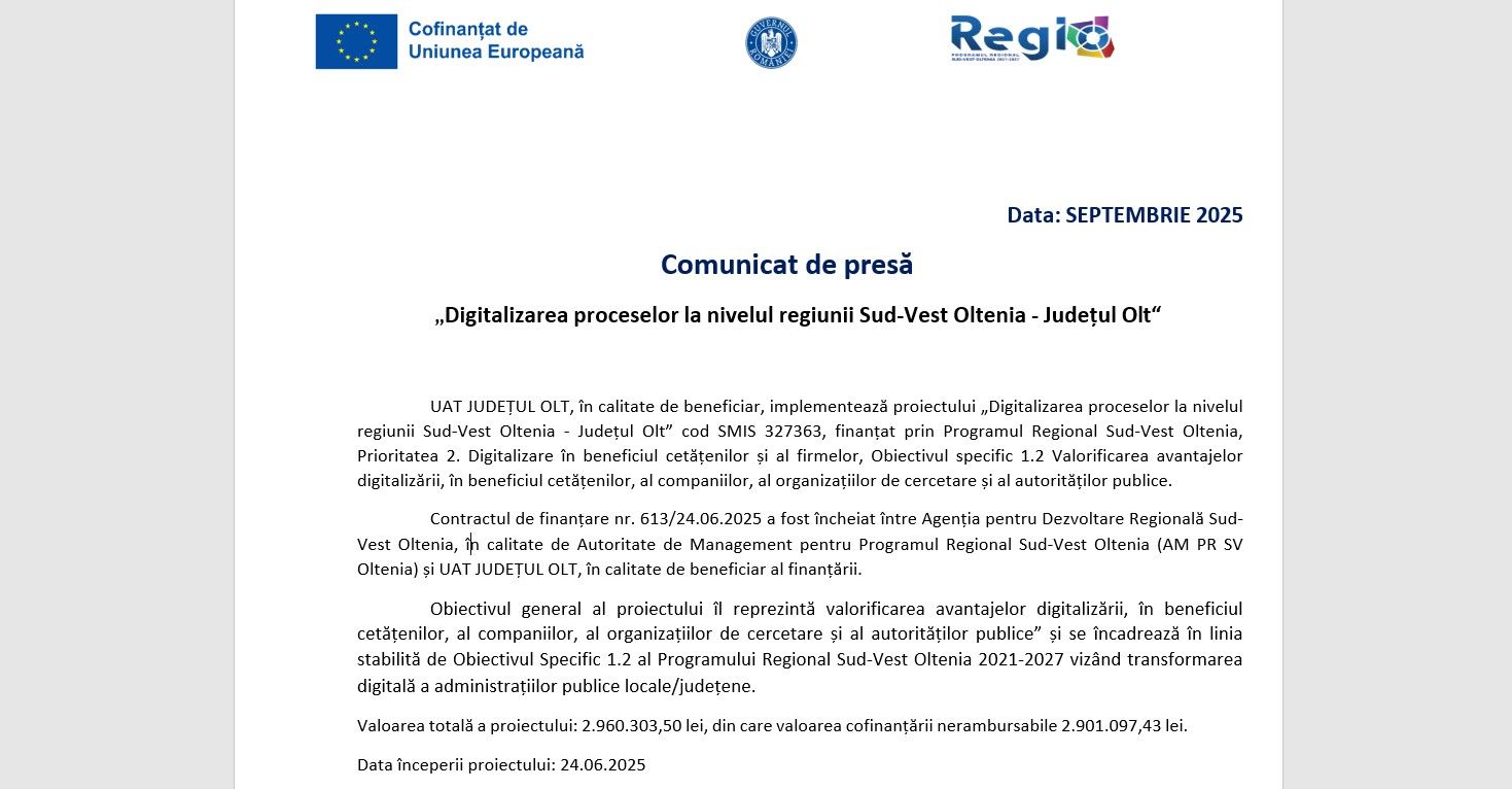 UAT JUDEȚUL OLT a anunțat demararea proiectului „Digitalizarea proceselor la nivelul regiunii Sud-Vest Oltenia – Județul Olt”, parte a Programului Regional Sud-Vest Oltenia, destinat îmbunătățirii serviciilor publice. Contractul de finanțare, semnat pe 24 iunie 2025, prevede o valoare totală de 2.960.303,50 lei, dintre care 2.901.097,43 lei vor fi asigurați prin fonduri nerambursabile.